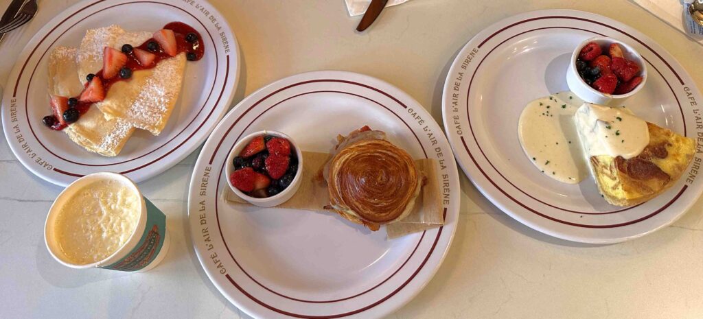 With only a couple of breakfast options in Epic Universe, we had planned brunch at Café L’air De La Sirène. It turned into one of the most relaxing moments of the day. The setting felt elegant but welcoming, a perfect balance before exploring.