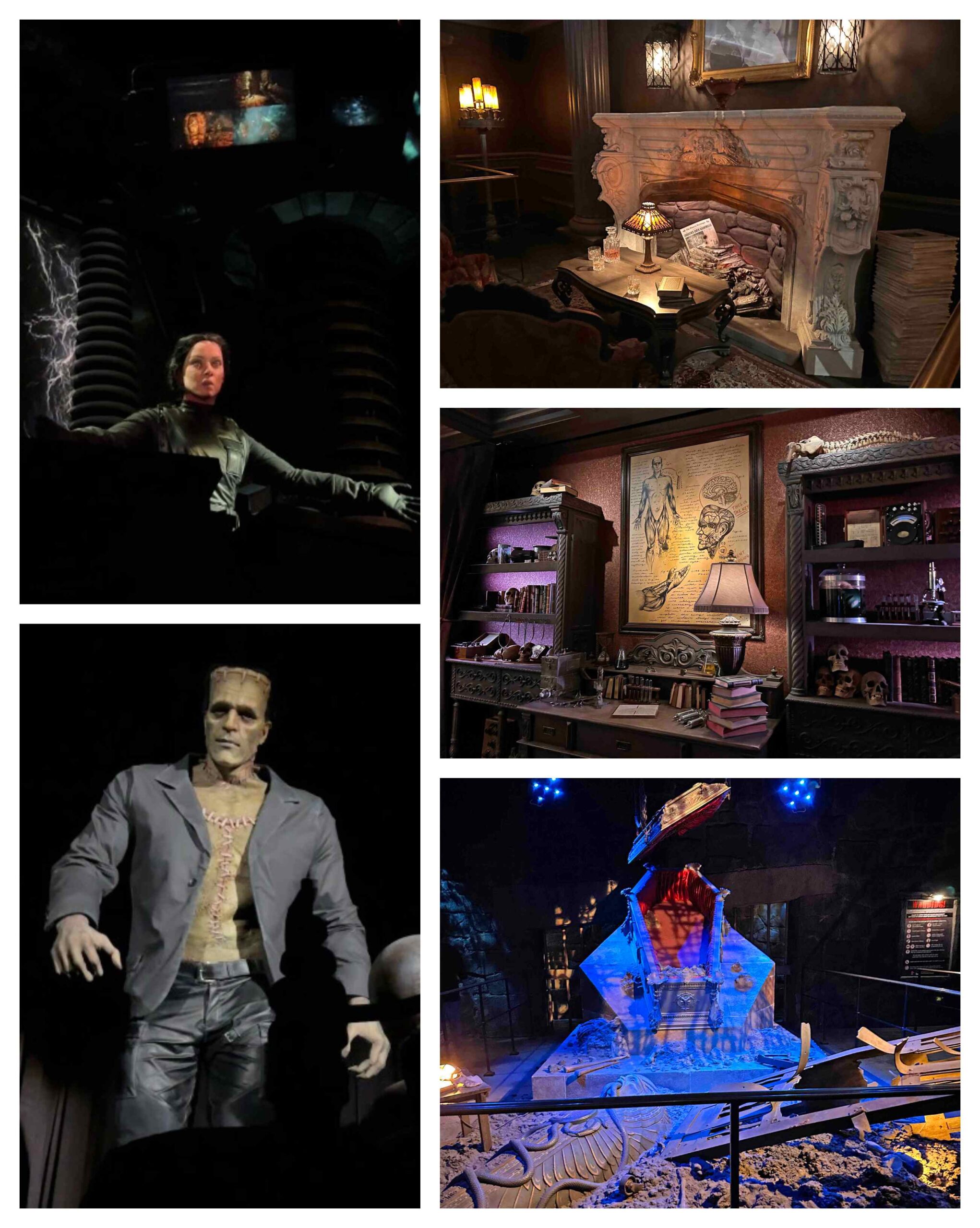 We found ourselves pausing often, not because we were unsure, but because there was so much to take in. Towering buildings, flickering lights, and subtle movement in the distance made it feel alive. This is the land where classic movie monsters come to life. Every corner brought the possibility of running into a horrific star of the silver screen.